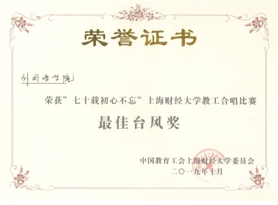 合唱队于10月15日参加了“七十载初心不忘”上海财经大学教工合唱比赛,队友们齐声高歌一首“今天是你的生日,我的中国”,唱出了对祖国的美好祝愿,抒发了深沉朴素的爱国情怀。