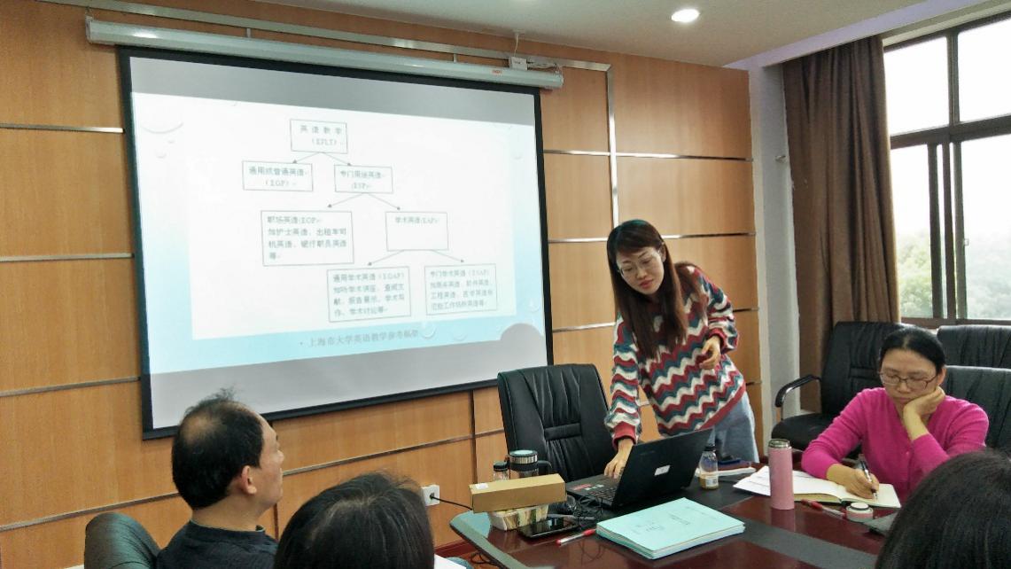 随后,张洁老师为大家作了题为“学术英语教学写作探索与实践”的报告。张老师从介绍上海市大学英语教学参考框架入手,重点介绍了我校学术英语写作教学具有阶梯性和综合性的特点,同时还指出现在存在的问题和不足,以及今后改进的计划。