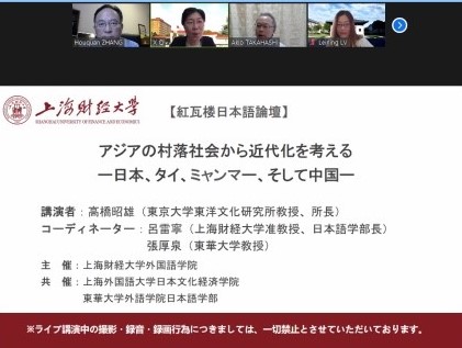 6月26日下午,上海财经大学外国语学院“红瓦楼日本语论坛”首期开讲。东京大学东洋文化研究所所长高桥昭雄教授应邀为我校及兄弟院校的师生们举办了一场题为“亚洲村落社会近代化的思考——以日本、泰国、缅甸和中国为例”的云端讲座。本次讲座由上海财经大学外国语学院主办,上海外国语大学文化经济学院和东华大学外语学院日语系协办,我院院长乔晓妹教授作开场发言,我院吕雷宁副教授和东华大学张厚泉教授共同主持。除了三校师生以外,复旦大学、同济大学、华东理工大学等其他兄弟院校师生也积极参与,与高桥教授展开了热烈的问答与讨论。