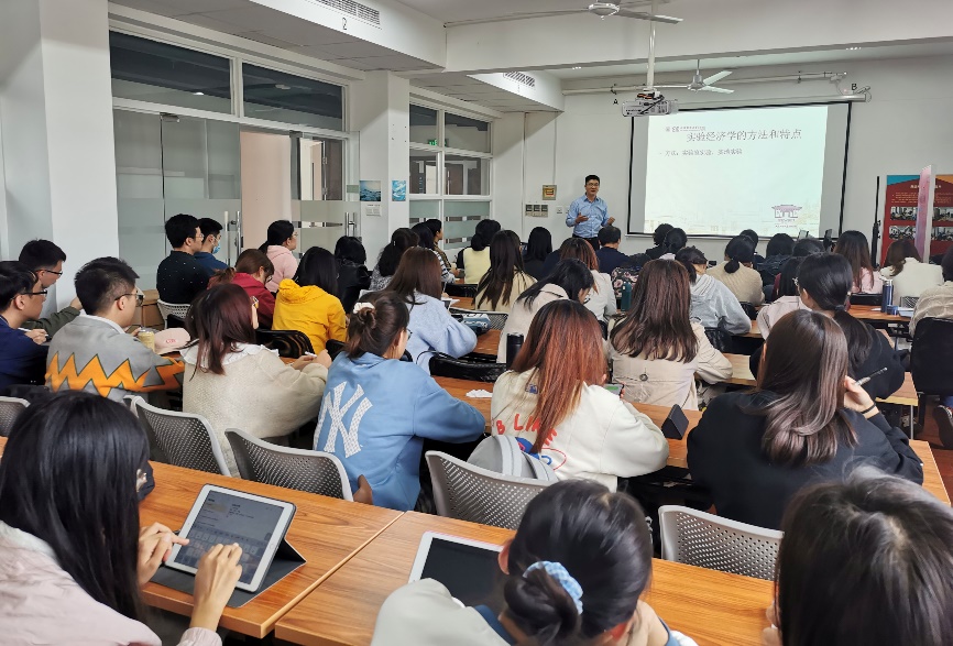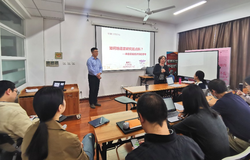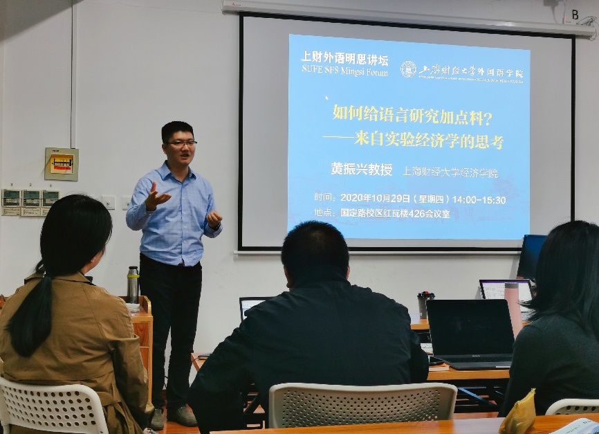 10月29日下午,上海财经大学经济学院黄振兴教授应邀作客“上财外语明思讲坛”,做了一场题为“如何给语言研究加点料?——来自实验经济学的思考”的精彩学术讲座。讲座由我院副院长赵珂教授主持,来自全校语言学研究领域的师生50余人参加了此次讲座。