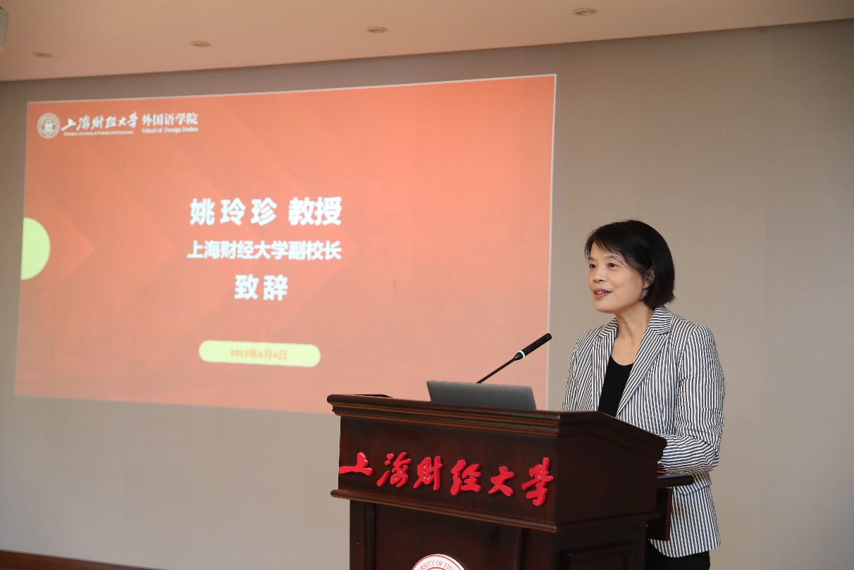 姚玲珍副校长首先代表学校和学院对与会嘉宾的莅临表达欢迎和感谢,并对外国语学院大学生创新创业中心表示祝贺。随后,她介绍了学校百年发展历程、服务国家经济金融战略与地方发展大局的阶段性成效、外国语学院国际化发展、人才培养模式与育人成效等。最后,她期待,新时代新征程,外国语学院大创中心能继续在校企合作、跨校合作、院系合作中实现强强联手、优势互补,激励一批又一批创新创业人才发挥才智和创意,助力国家经济发展与国际传播,为全面建成社会主义现代化强国贡献力量。