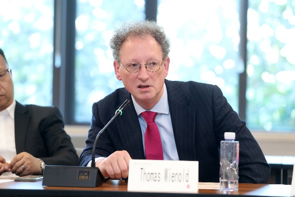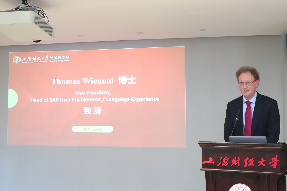 Thomas Wienold副总裁回顾了SAP企业发展历程以及与上财等高校深度的校企合作成效。他指出,对SAP而言,保持亲近感,更接近学生,并了解他们的未来是非常重要的。反之亦然。上财也明白,让学生们在专业学习之余,有机会接触商业世界,学习与其他国家、其他语言文化进行对话和建立理解是很有意义的。SAP与上财外国语学院已经有了很好的合作基础,希望以外国语学院大创中心的成立为契机,进一步开拓数智时代跨文化理解、商务沟通、机器翻译等领域更广阔的合作空间,共筑未来。