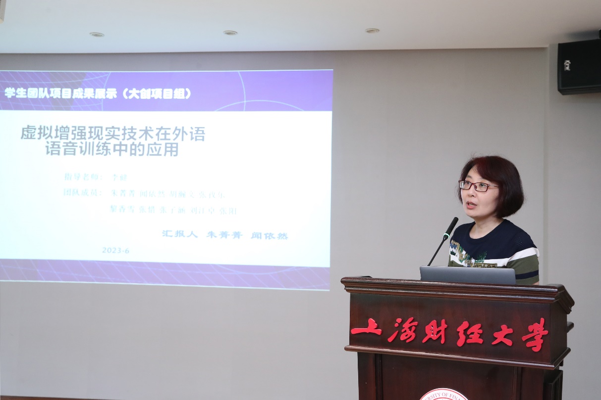 在学生团队项目成果展示环节,作为大创项目组代表“增强现实的应用与正音技术创新团队”,外国语学院李健副教授带领2020级商务英语专业本科生朱菁菁、闻依然同学共同汇报了“虚拟增强现实技术在外语语音训练中的应用”这一项目,并分别介绍了师生合作发表的2篇国际SSCI期刊一区论文的研究成果和学术获奖情况。团队充分体现了要做到顶“天”立“地”、一举多得、一专多能,依托新理论、新技术、新方法,实现产学研协同创新,推动商业项目孵化、技术专利、学术论文等多项成果,助力人才培养和社会发展。