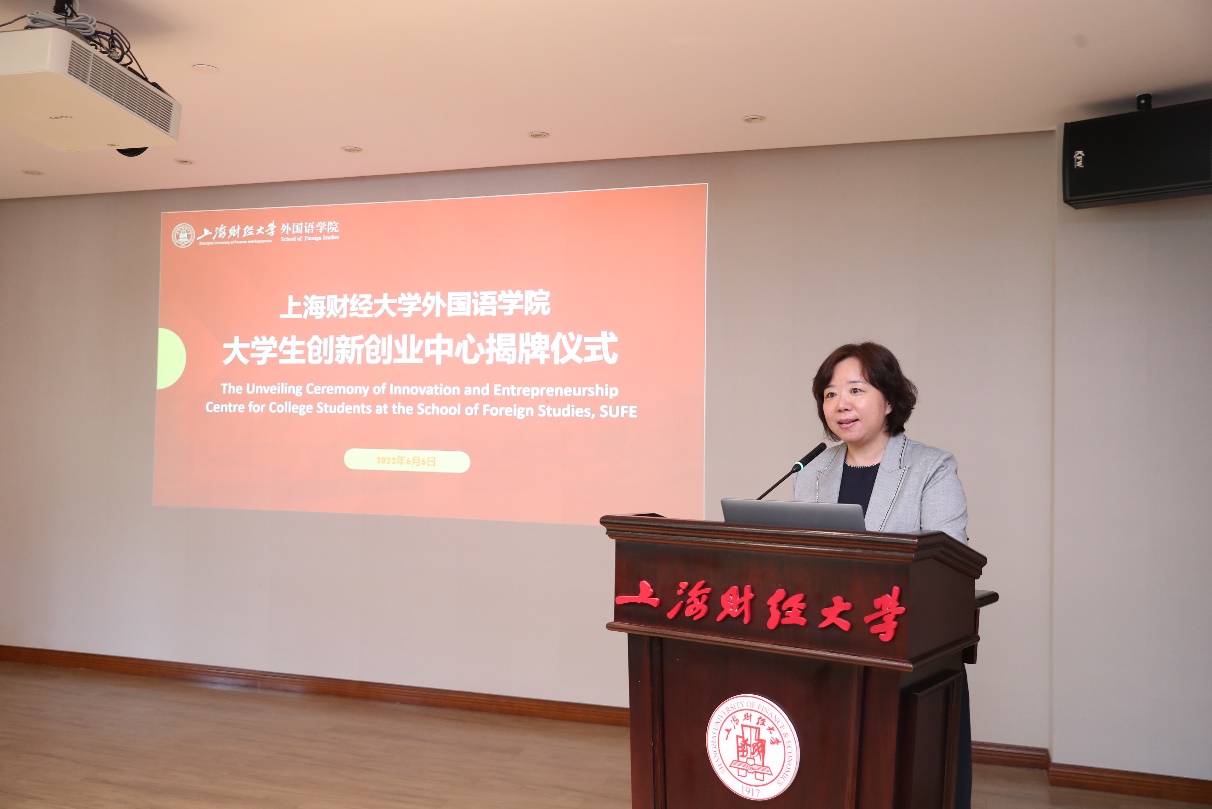 杨丹老师代表创新创业学院执行副院长刘志阳教授致辞。她表示,外国语学院作为学校“双创人才培养试验区”,与创新创业学院共同组织、协调和指导学生创新创业活动,开展了全方位的合作,充分肯定了外国语学院在创新创业人才培养的创新型和前瞻性,尤其是近两年刷新了学校在多项高级别创新创业赛事历史最好成绩。他指出,今天外国语学院大创中心的成立既是学院深化创新创业教育改革的生动实践,更是推进学校的双创教育工作的一个重要突破,期待中心持续为同学们提供多层次、立体化的创新创业服务和资源支持,为学生创业报国的中国梦提供有力保障。