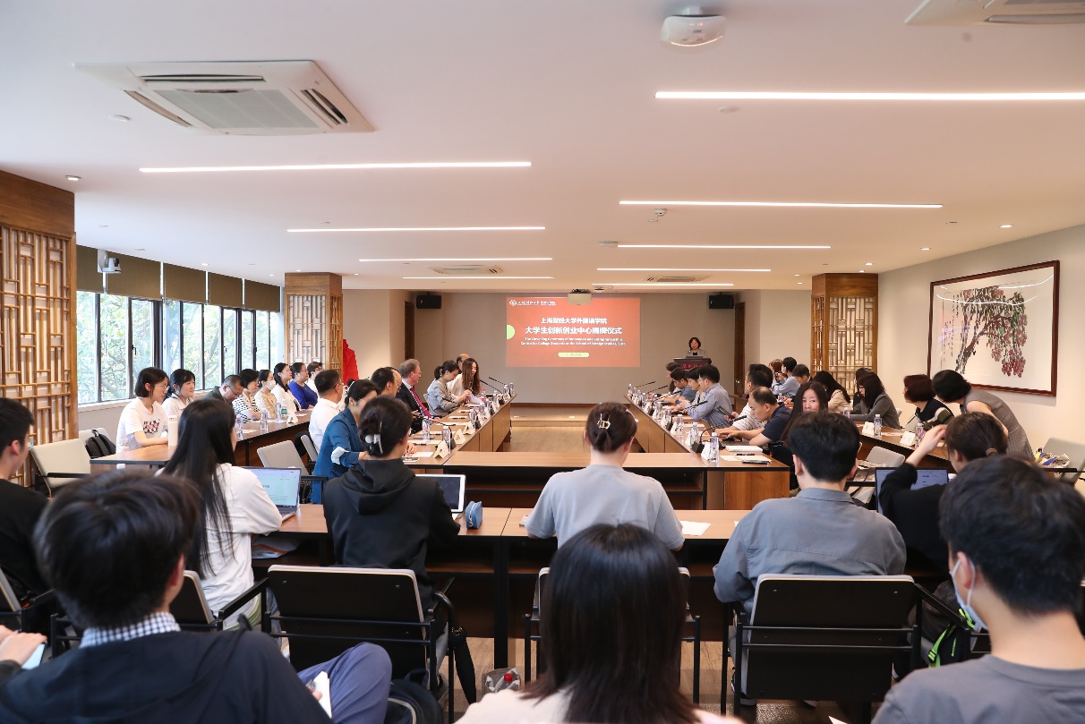 中国对外贸易经济合作企业协会副会长郑樑,思爱普(SAP)公司副总裁Thomas Wienold,思爱普(中国)有限公司语言体验部经理张羽、大学联盟负责人Josie Guan等,同济大学软件学院助理教授杜博闻,上海财经大学副校长姚玲珍,科研处处长、创新创业学院执行副院长刘志阳,团委书记沈亦骏、教务处处长吴纯杰、研究生院副院长谢永康、创新创业学院杨丹,以及外国语学院党委书记蒋萍、院长赵珂、副院长郭鸿杰、党委副书记赵蔚以及学院师生代表出席仪式。会议包括揭牌仪式、学生团队项目成果展示、走近创新创业学院、导师面对面等环节。