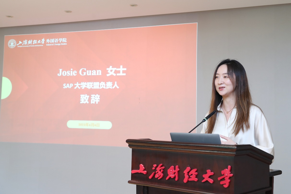 Josie Guan女士在致辞中回顾了SAP与上财、与外国语学院在创新创业教育方面的合作基础。她指出,高校作为双创人才培养的重要阵地,拥有更自由、开放、包容的空间和更优质丰富的资源环境。上财正是如此,始终高度重视创新人才培养,很荣幸今天应邀见证外国语学院大创中心的成立,期待未来SAP与中心开展更多的合作,助力培养更多具有思辨能力,敢于质疑权威,不应循守旧的国际化复合型人才,共同推进社会的进步。