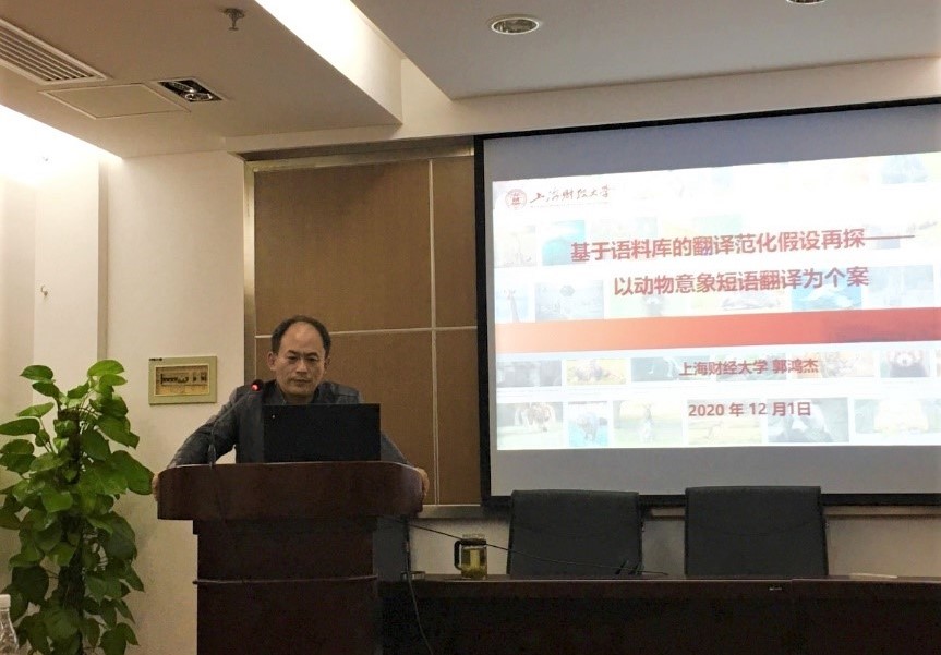 随后,郭教授向大家介绍了语料库翻译学、翻译共性假说、范化和短语翻译等相关概念和理论,并将研究背景、研究设计和研究结果向大家一一呈现并展开详述。该研究是基于财经和科普两大专业语料库,通过分析含有动物意象的英语短语翻译模式以及制约机制来验证翻译文本的范化假设。
