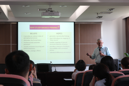 Forster教授是将掩蔽启动范式(masked priming)应用于词汇识别研究的创始者,在两天的讲座中他详细介绍了掩蔽启动效应的原理与机制及掩蔽启动范式在二语加工、句子加工等研究中的应用。这对教师和学生们今后使用该范式进行语言研究起了重要的启发和指导作用。