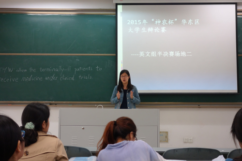 2015年“神农杯”辩论公开赛于4月17日至4月19日在中国药科大学举行。此次2015年华东赛区大学生辩论公开赛由美国霍巴特和威廉姆史密斯学院(Hobart and William Smith College)、中国辩论教育联络组(CDEN)主办,是华东地区大学生辩论的最重要赛事。本次比赛历时三天,来自上海、浙江、福建、安徽、山东、湖北和江苏七省共31所高校的72支中英文参赛队伍共计200多名选手和裁判参加比赛。比赛采取英国议会制赛制,讨论了诸如教育资源分配,临床试验,世界银行等覆盖面极广的问题。英语组共有来自华东各高校的48支英文辩论队参加。我校选手张欣嘉,郭辰在此次比赛中成功晋级半决赛,决赛并获得季军,黄筱曼获得二等奖。在比赛中,选手们收获了珍贵的参赛经验,与来自华东地区各高校的老师和辩手们进行了交流,受益匪浅。