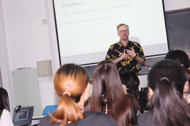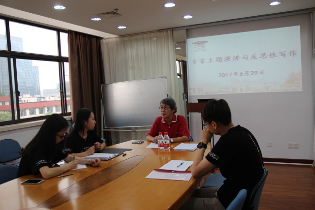 集体合影结束后便进入了本次夏令营的高潮重要环节--专家主题演讲与反思性写作。此次环节分为英语组与日语组两组。来自赫尔辛基大学的Fred Dervin教授为英语组营员们带来了一场题为“Intercultural communication today:Beyond culture?”精彩讲座,Fred教授与在场的师生就跨文化方面的学术前沿热点问题进行了深入探讨,营员们纷纷发表了各自的见解,现场气氛热烈非凡。