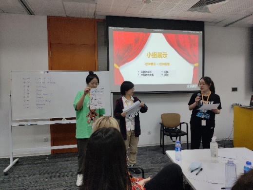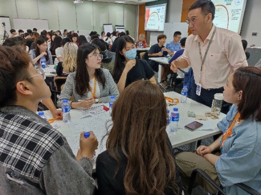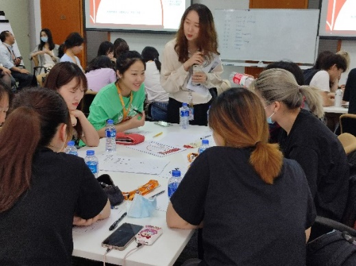 接着,关铮和翻译交付经理马骏共同讲授“设计思维工作坊”。通过丰富的示例和生动的游戏介绍了设计的概念、模式和要素,老师们引入“重新设计食堂内的用餐体验”这一案例,让同学们自由组队,在访谈调查、团队思考中感受了解用户画像、需求洞察以及构思创意等实践环节,学习“理解-观察-定义-创新-原型-测试”设计流程,理解并运用设计思维方法论,从而提升发现问题、重构问题并解决真实世界中人的问题的能力。同学们积极思考,提出了多维度问题及其解决方案且汇报形式多元有趣,得到工作坊老师们的充分认可和积极反馈。
