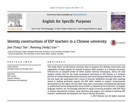 本期与大家分享我院陶坚博士与新南威尔士大学副教授高雪松博士合作的文章“Identity constructions of ESP teachers in a Chinese university”。目前该论文已于国际学术期刊English for Specific Purposes(SSCI一区)正式发表(Volume 49,January 2018,Pages 1-13)。