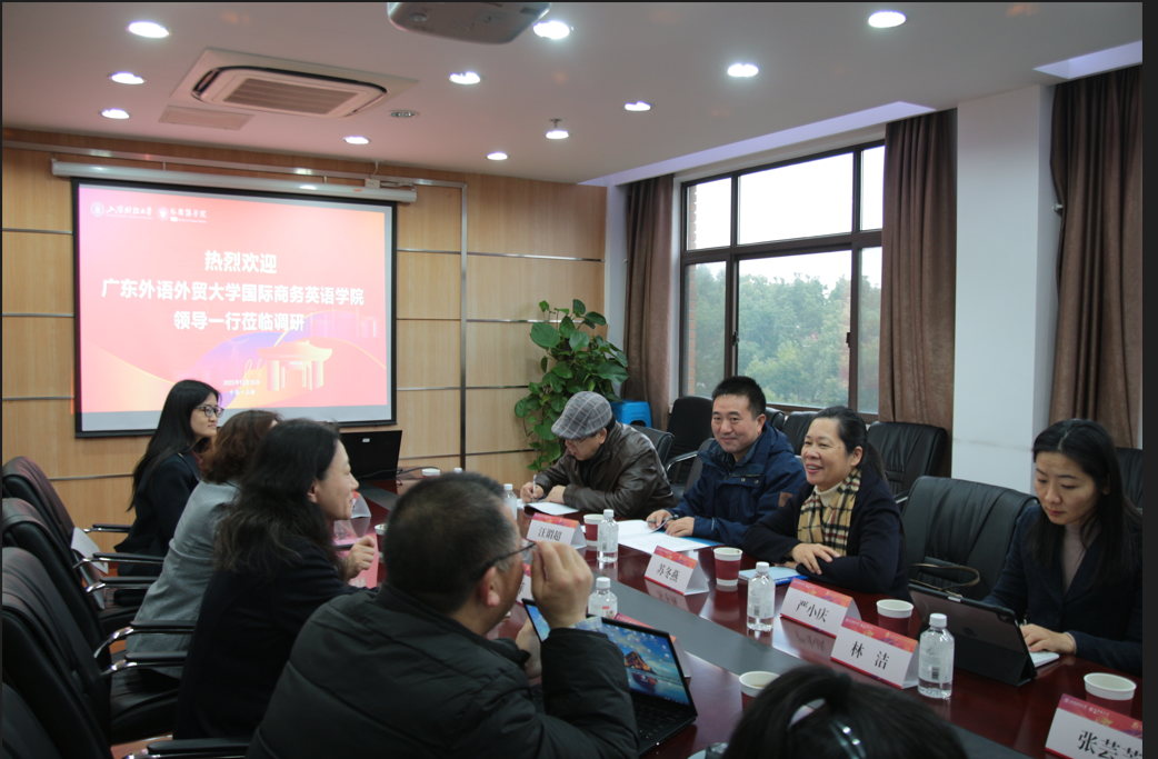 12月15日下午,广东外语外贸大学国际商务英语学院书记苏冬燕、副院长汪谓超、系主任张新红、副系主任林洁以及张芸芝老师等一行来我院调研交流。我院党委书记蒋萍博士、院长赵珂教授、英语系主任艾斌教授、英语系教师盛亚南博士、本科生教务秘书王琰老师参加了本次调研交流会。