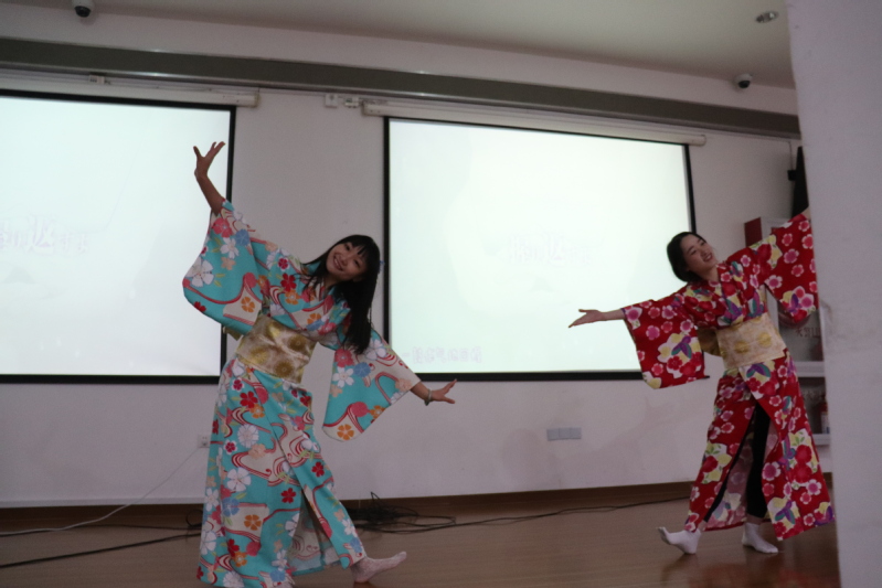 在二次元文化介绍环节中,双语协会的同学为我们带来了数码宝贝主题曲《brave heart》。友情、勇气、永不放弃的信念贯穿其中,赋予了这首歌积极向上的力量,并唤起了在场观众共同的童年记忆。风云动漫社的同学为带来了舞蹈《小埋体操》和《东京夏日相会》。外表秀丽、文武双全的小埋,在家却是那么的小孩子气,所谓的“反差萌”治愈了每一位观众。《东京夏日相会》舞蹈中,身穿浴衣的女生让我们联想到了日本传统的烟花大会,身着浴衣、脚踏木屐、团扇轻扑、捞金鱼吃苹果糖、夏日盛放的烟火和萤火虫的微光,为淡淡的恋情着上了最温情绚烂的色彩。