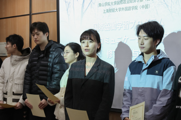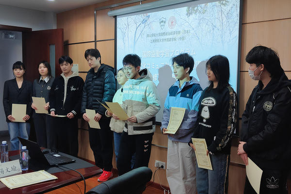 3月19日下午,上海财经大学外国语学院与日本青山学院大学国际政治经济学部在外国语学院426会议室,为修习两校共建《跨文化沟通研讨Ⅱ》课程的10名学员举办了隆重的结业证书颁发仪式。