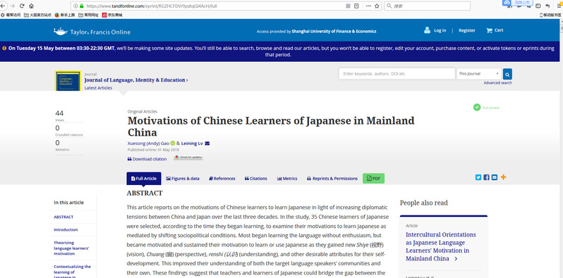 本期与大家分享我院日语系吕雷宁副教授(通讯作者)与新南威尔士大学副教授高雪松博士合作发表于SSCI国际学术期刊Journal of Language, Identity & Education的论文“Motivations of Chinese Learners of Japanese in Mainland China”(Published online: 01 May 2018).该论文从我国日语学习者的角度对语言学习动机进行了重新阐释,对语言学习动机的研究发展做出了一定的贡献。