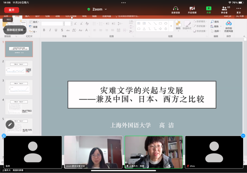 2021年11月20日下午,上海财经大学外国语学院日本文化研究所举办了“第十二期上海高校日本文学沙龙”,特邀上海外国语大学高洁教授做题为《灾难文学的兴起与发展——兼及中国、日本、西方之比较》讲座,外国语学院日本文化研究所所长朱卫红副教授主持了本次讲座。