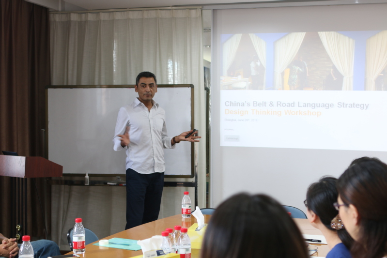 下午的学术沙龙与设计思维工作坊活动在两个会场同时进行。426会场开展了由上海财经大学Ashley Simpson博士、北京航空航天大学任伟教授、复旦大学郑咏滟教授和上海外国语大学李茨婷博士共同主持的学术沙龙。与会学者和研究生围绕跨文化语用的相关话题各抒己见,探讨共同感兴趣的前沿研究课题。606会场进行了由SAP设计思维团队Anwar先生主持的设计思维工作坊。Anwar先生首先介绍了设计思维的理念、发展以及在商界的实际应用,并回顾了联合研究中心团队访问SAP时参与的设计思维活动。随后,来自学界与SAP的参与者组成了三个团队,着重探讨了“一带一路”背景下中国企业“走出去”过程中遇到的三个挑战。各团队成员经过讨论形成清晰的问题,并运用各自不同的知识背景,进行了深入分析并提出最佳解决方案。