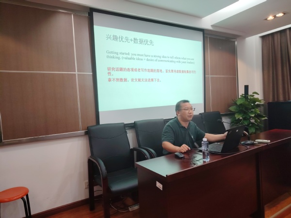 接下来,刘向军副教授主要从翻译论文选题方向进行辅导讲座。首先,他从最近的一次与出版社的翻译交稿的改稿交流出发,引出几对概念与不同实践之间的区别,分别是:英译汉与汉译英的区别、学术翻译与文学翻译的区别、英语与汉语的区别、专业内外背景的译者之间的区别等等,由此出发,阐述“译有所思、思有所记、记有所研、研有所得”,鼓励学生将自己的日常英语和翻译学习与毕业前的论文写作系统有机地关联起来。然后是具体的论文写作的操作层面,尤其是论文写作中的理论框架与案例的选择问题,强调论文写作过程中学生主动与导师指导的密切结合,学生作为论文的第一责任人,要积极主动、责无旁贷。接着,刘老师还介绍了论文写作中的模仿“捷径”,引导学生“见贤思齐”,努力快速推进写作进度。