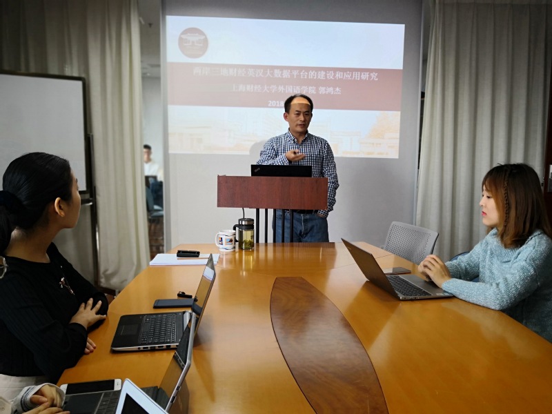 10月16日下午,外国语学院新进教师郭鸿杰教授于上海财经大学国定路校区红瓦楼606会议室举办了一场题为“两岸三地英汉财经大数据平台建设构想及平行语料库加工流程”的项目启动报告会,外国语学院副院长李金满教授、MTI教育中心主任张达球副教授出席了报告会,学院教师、外国语学院及上财其他学院的二年级本科同学近30人济济一堂,听取了此次报告会。