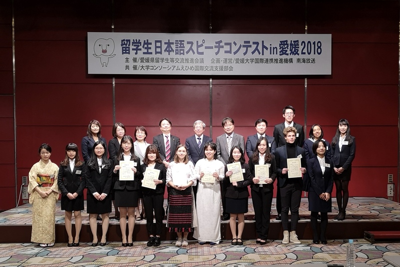 本次比赛由「愛媛県留学生等交流推進会議」主办,「愛媛大学国際連携推進機構・南海放送株式会社」承办。比赛汇集了来自中国、罗马尼亚、韩国、越南等7个国家的15名优秀选手,他们同台竞技,一展才华。比赛内容通过网络和电台向全世界直播。15名选手热情洋溢的演讲、丰富的内容与流利的日语表达获得了在场观众及评委老师的高度评价。