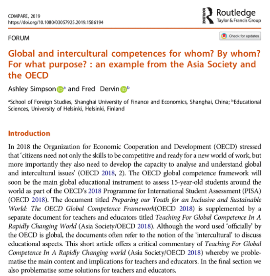 本期分享我院Dr. Ashley Simpson和Prof. Fred Dervin共同发表于SSCI二区国际学术期刊Compare: A Journal of Comparative and International Education的论文“Global and intercultural competences for whom? By whom? For what purpose? an example from The Asia Society and OECD”(Published online 6th March 2019)。