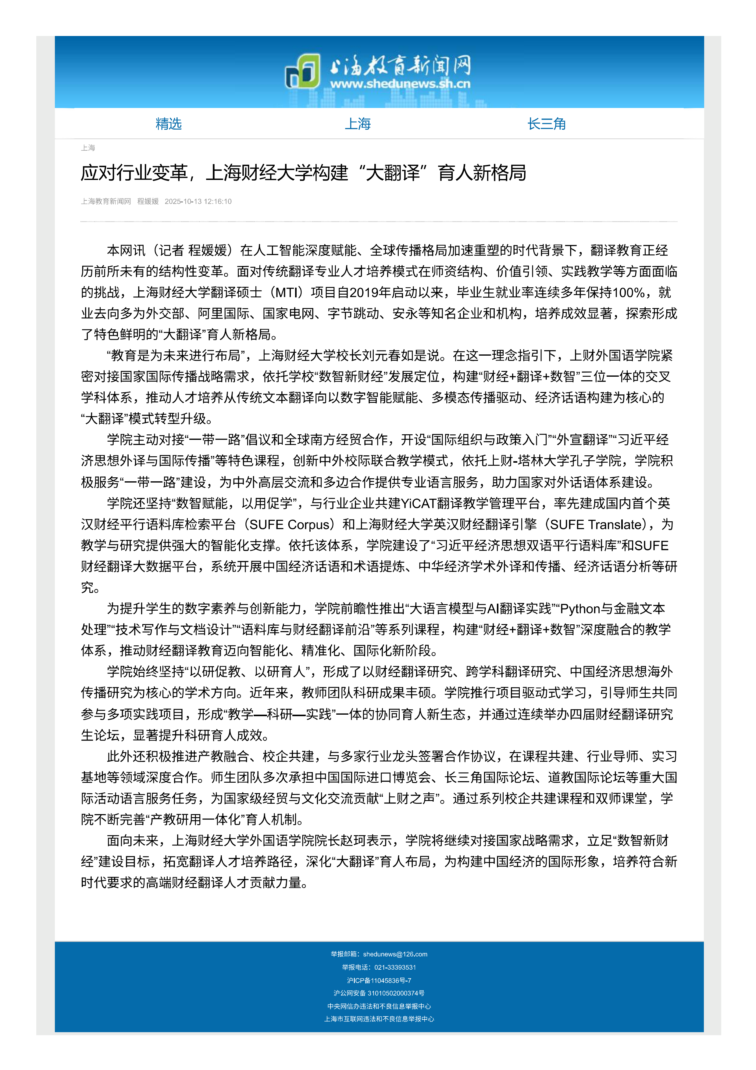 本网讯(记者 程媛媛)在人工智能深度赋能、全球传播格局加速重塑的时代背景下,翻译教育正经历前所未有的结构性变革。面对传统翻译专业人才培养模式在师资结构、价值引领、实践教学等方面面临的挑战,上海财经大学翻译硕士(MTI)项目自2019年启动以来,毕业生就业率连续多年保持100%,就业去向多为外交部、阿里国际、国家电网、字节跳动、安永等知名企业和机构,培养成效显著,探索形成了特色鲜明的“大翻译”育人新格局。