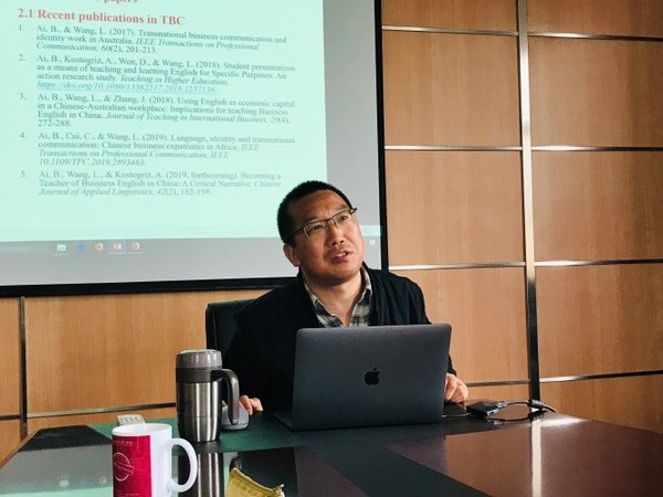 4月19日上午,上海财经大学-赫尔辛基大学联合跨文化研究中心学术沙龙在红瓦楼426会议室举办。我院艾斌副教授受邀做了一场题为“A socio-cultural critique of writing transnational business communication: A reflective narrative”的精彩学术沙龙,吸引了我院语言学方向的多位师生参会。
