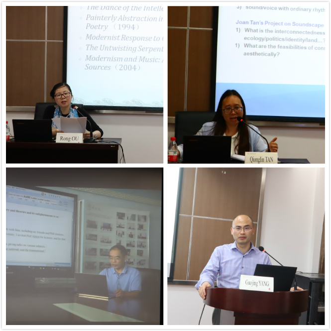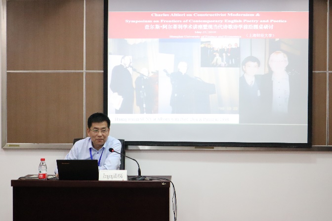 当天下午,杭州师范大学外国语学院院长欧荣教授首先围绕“当代欧美现代主义研究评述”这一主题作了主旨发言。欧荣教授梳理了国内外对于现代主义这一文学流派的学术研究现状,主要聚焦现代主义和东方研究、现代主义中的跨艺术诗学、现代主义中的城市书写,以及现代主义和后现代主义的学理逻辑关系等。接着,我院讲席教授谭琼琳教授作了题为“声音、诗歌与声音诗学:美国旧金山文艺复兴时期诗歌之思考”的主旨发言。谭琼琳教授具体研究了诗歌创作、诗学和声音/语音的相互关联,从加里·斯奈德的诗歌入手,考察了声音诗学在认知、美学、理论上的可行性。随后,广西民族大学外国语学院张跃军教授通过视频方式,分享了他与阿尔蒂利教授的学术互动经历,并重点梳理了阿尔蒂利教授关于情动美学理论研究的特色、进展以及启示。最后,我院特任研究员杨国静副教授作了题为“内在主义诗学:查尔斯·阿尔蒂利的美国后现代主义诗歌转型机制研究”的主旨发言。杨国静研究员首先对阿尔蒂利的后现代诗歌内在模式展开分析,然后以客体派诗人为例,通过对茹科夫斯基、雷兹尼科夫和奥本等诗歌创作理念的细致分析,指出除了美学根源之外,作家的政治倾向和伦理动机也是我们研究诗歌转型机制不能忽视的重要部分。