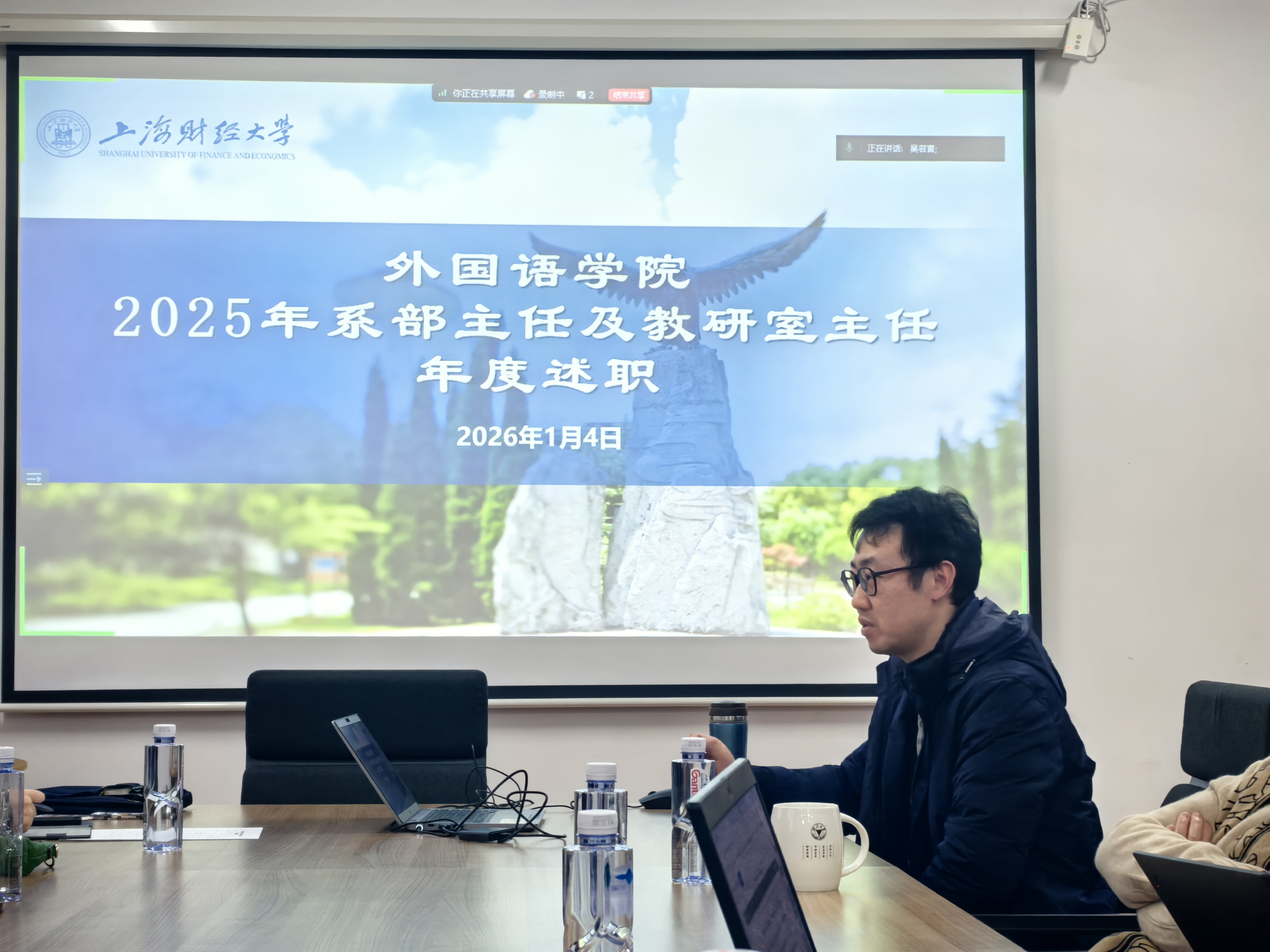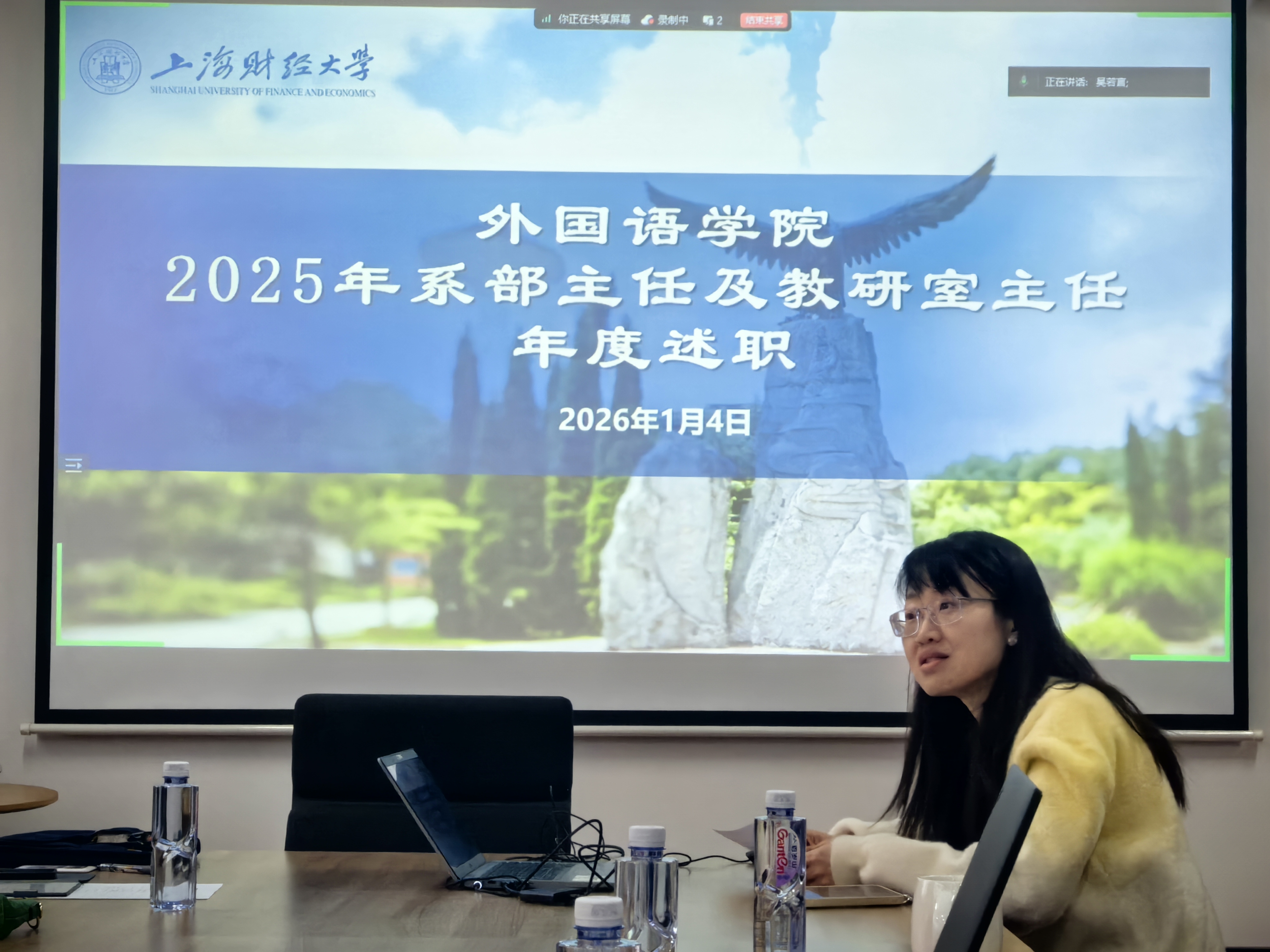 2026年1月4日下午,上海财经大学外国语学院2025年度系部及教研室主任述职会议在红瓦楼408会议室顺利召开。作为学院夯实基层教学组织根基、深化教育教学改革的关键举措,本次会议以“总结沉淀促提升,凝心聚力谋发展”为核心,系统梳理各系部及教研室在教育教学提质、课程体系建设、特色人才培养等核心工作中的成效与经验,精准剖析发展短板,共商未来突破路径。外国语学院党委书记赵蔚,院长赵珂,副院长杨国静,各系部主任及全体教研室主任出席会议。值得关注的是,本次会议首次将系部主任与教研室主任纳入统一年度述职体系,既是响应学校绩效改革部署、推动基层教学组织规范化、精细化建设的战略实践,更构建了上下联动、横向协同的交流互鉴平台,为学院锚定高质量发展方向、筑牢人才培养核心阵地提供了保障。