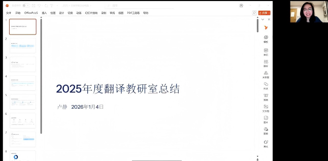 翻译教研室主任卢静老师指出,2025年教研室以课程思政为引领,依托商务翻译与财经翻译课程,系统推动师德师风与思政育人融入教学,并在财经大数据平台建设中融入中国经济思想语料,凸显专业特色。前瞻布局AI赋能翻译教学,构建课程、案例与研究协同机制;持续推进“国家战略—数智引领—校本特色”案例库建设,并在全国MTI教学案例大赛中获多项奖励;积极推动科研反哺教学,教师在中华学术外译、教材出版及学生创新创业指导等方面成果突出。展望2026年,教研室将进一步优化教学科研协同机制,探索MTI实践课程向本科延伸,推进AI+课程群建设,深化“翻译中国”多模态育人实践,持续建设协作共享、富有人文温度的数智化教研共同体。