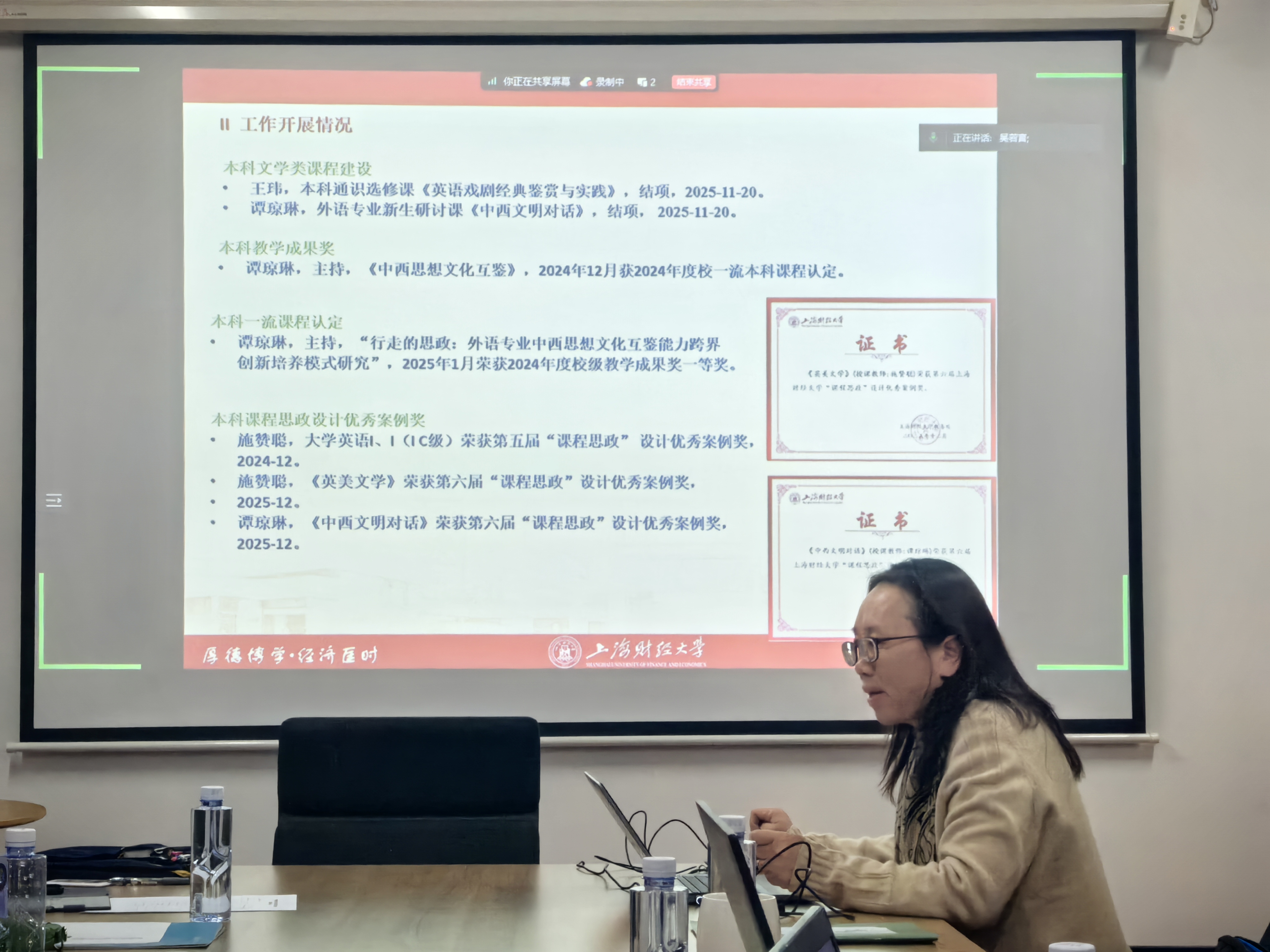 张洁老师对专门用途外语教研室及大学外语教学部的工作进行了整合汇报。专门用途外语教研室聚焦学术英语课程改革与探索,扎实推动研究生英语教学体系建设,顺利组织覆盖千余人的研究生英语免修考试与课程教学。通过深入调研兄弟院校、改革新生分级考试、走进会计学院开展协同育人研讨等,为制定与优化新培养方案奠定了坚实基础。大学外语教学部则以日常教学与教学改革为工作主线,积极构建教学改革框架,全面推进“上海财经大学公共外语全球胜任力提升工程”,通过举办高水平学术英语论坛、启动系列校际外语赛事等举措,有效提升了学生的国际竞争力与跨文化能力,推动学生在“外研社·国才杯”等国家级赛事中取得优异成绩。大学外语教学部凭借在教学与团队建设中的突出表现,荣获“全国三八红旗集体”推荐资格。