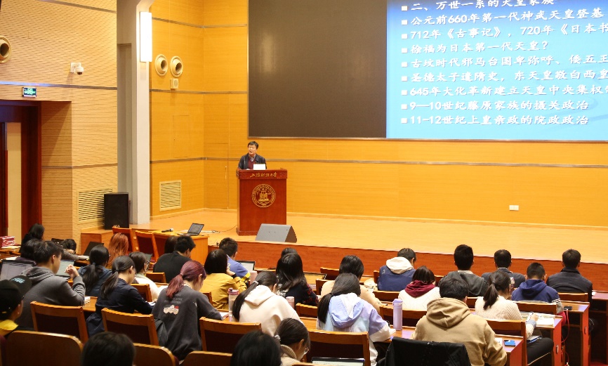 随后,王新生教授着重讲述了日本天皇家族的历史演变、近代天皇制和象征天皇制。王教授以卑弥呼、圣德太子、大化改新、摄关政治、院政政治等代表性历史事件和人物为例,生动有趣地呈现了天皇在日本古代史的形成和发展。其中他还对关于第一代天皇为徐福的可能性、大化改新后天皇身份的转变,以及日本南北朝时代的天皇的正统性问题着重进行了讲解。关于战后日本的象征天皇制,王教授为我们讲述了日本战后修宪、天皇的人间宣言等历史事件,并分析了《日本国宪法》中作为“象征天皇”的权限规定。最后,王教授为我们分析了天皇制在日本的社会与政治功能,讲到天皇及皇室家族的举动在日本政治和社会等方面的深刻影响,指出天皇在现代日本民众中依然具有崇高地位。今年,日本明仁天皇生前退位和令和时代的开启不仅在日本社会引起较大反响,而且也吸引了世界各国的目光,可以看出天皇与天皇制在日本社会乃至政治领域具有很强的影响力。